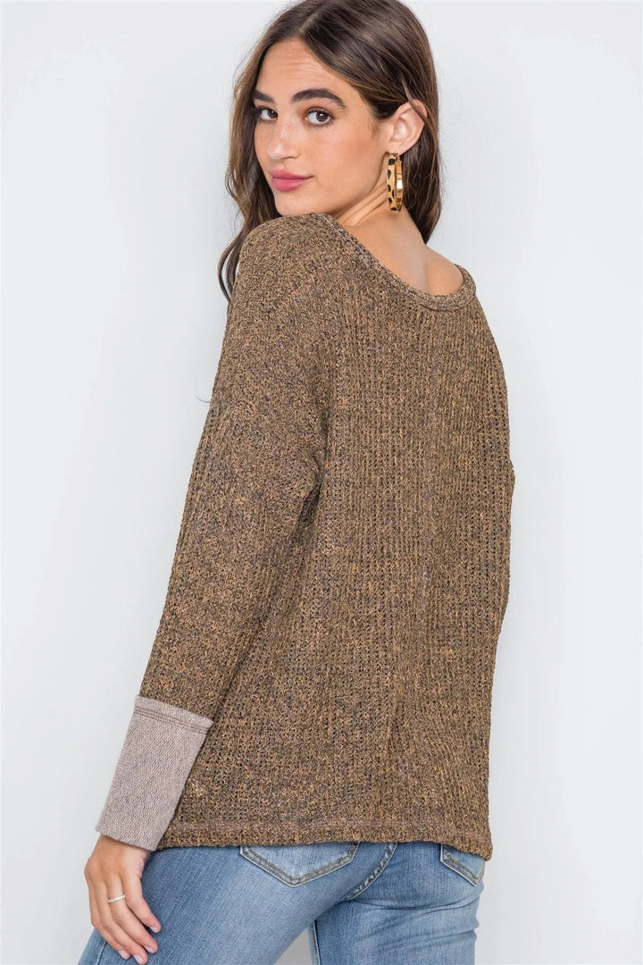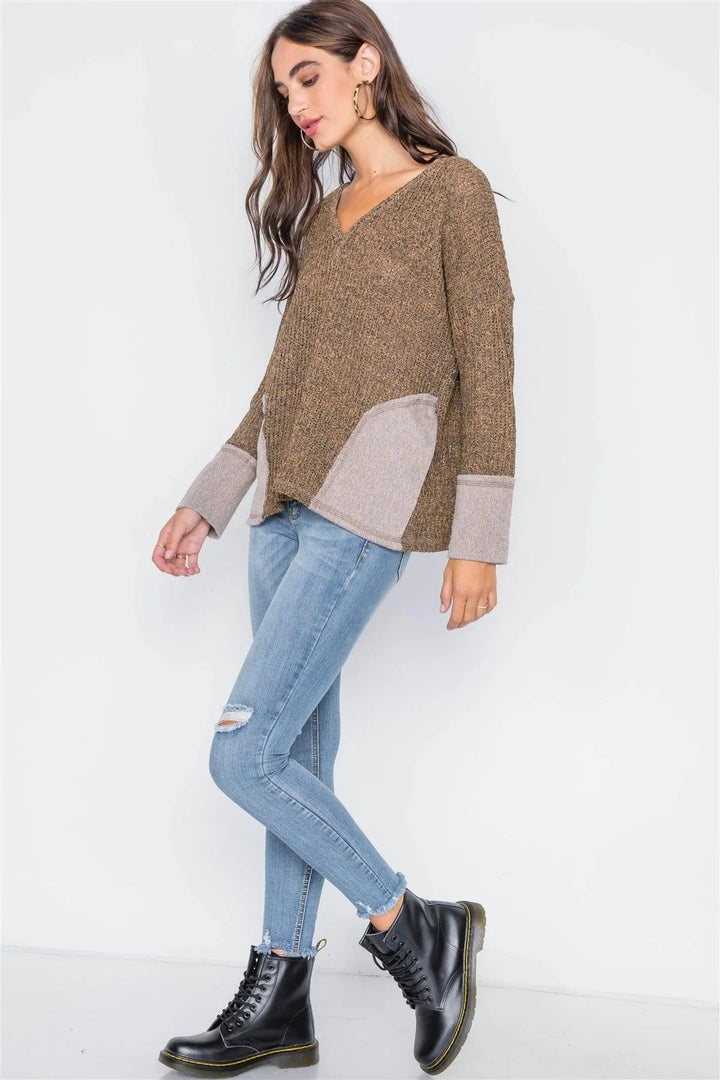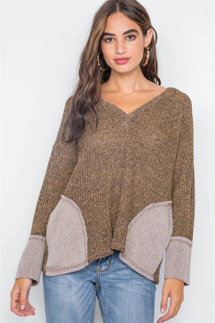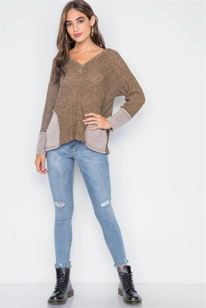 Sweater features: long sleeves with contrast cuffs, V-Neck, contrast side pockets, dropped shoulders, slightly sheer, relaxed fitModel is 5'9 wearing a size Small (Waist: 24", Bust: 32A, Hips: 34")Size Small Item Measurements: Length: 27", Bust: 46", Sleeves: 17.5"True to size