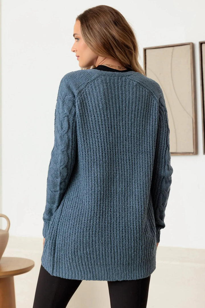 Wrap yourself in luxury with our Open Front Cable-Knit Long Sleeve Cardigan. Featuring a timeless cable-knit design, this cardigan is both elegant and practical, perfect for layering during cooler weather. The open front adds a touch of sophistication, making it a staple piece for any wardrobe.