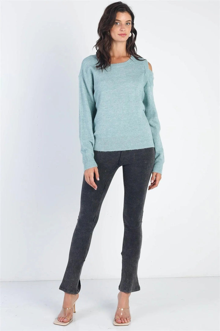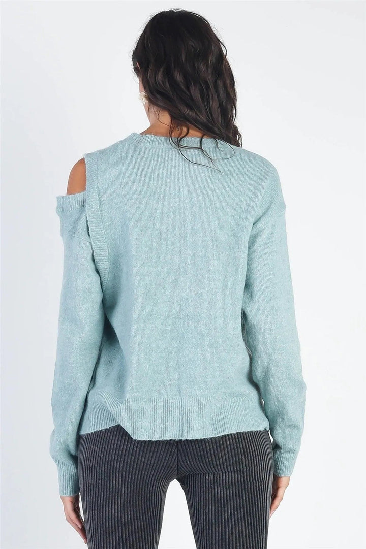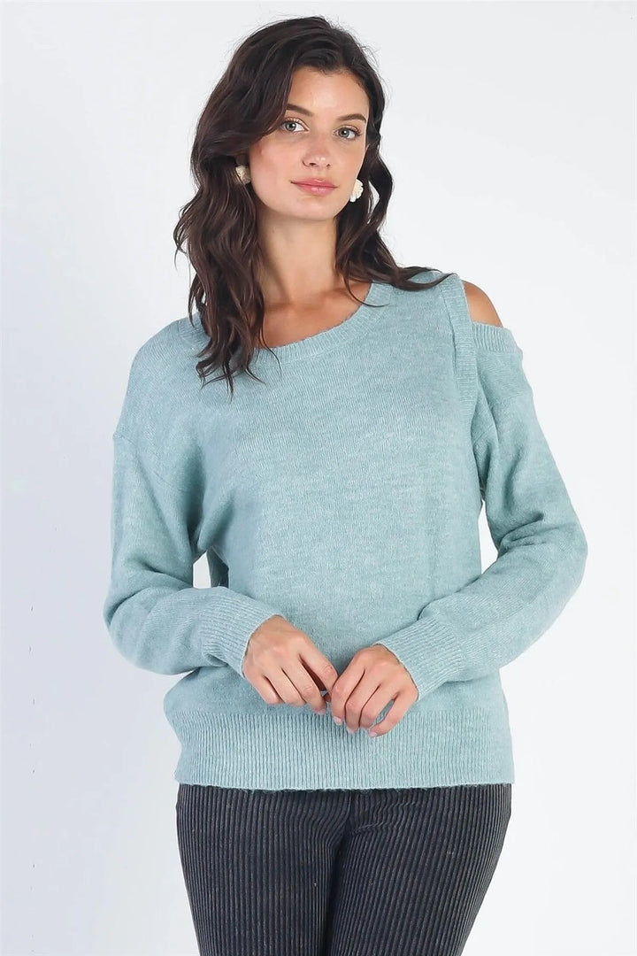 🖤 This cozy knit sweater is the perfect addition to your winter wardrobe. The one side cold shoulder and ribbed details add a stylish touch to the warm and stretchy teal material. Stay comfy and cute with its relaxed fit and long sleeves.