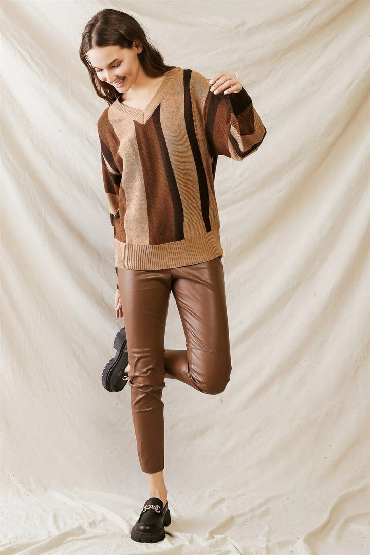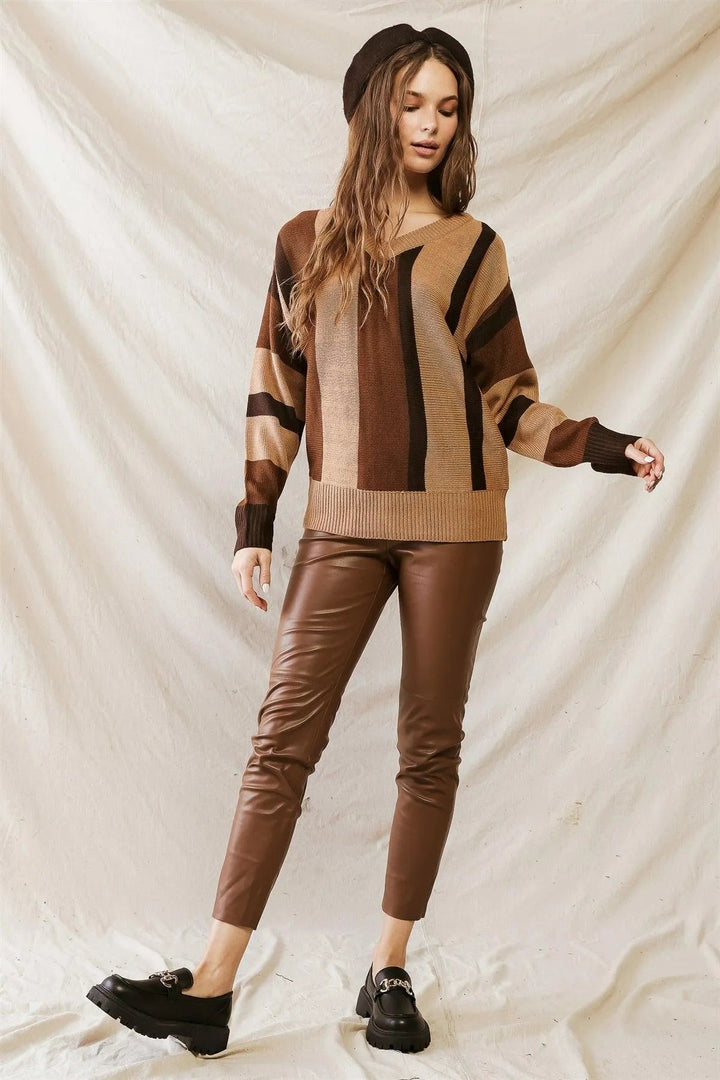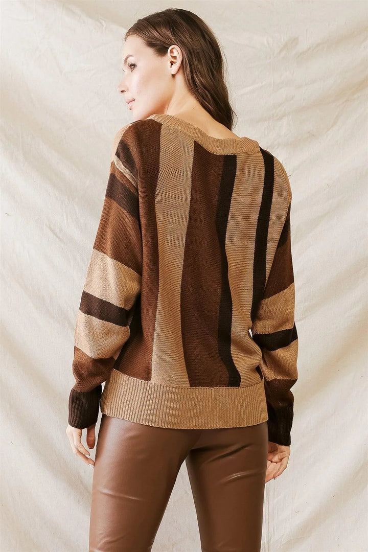 Brown Multi Colorblock V-Neck Knit Sweater – Women’s Long Sleeve Pullover