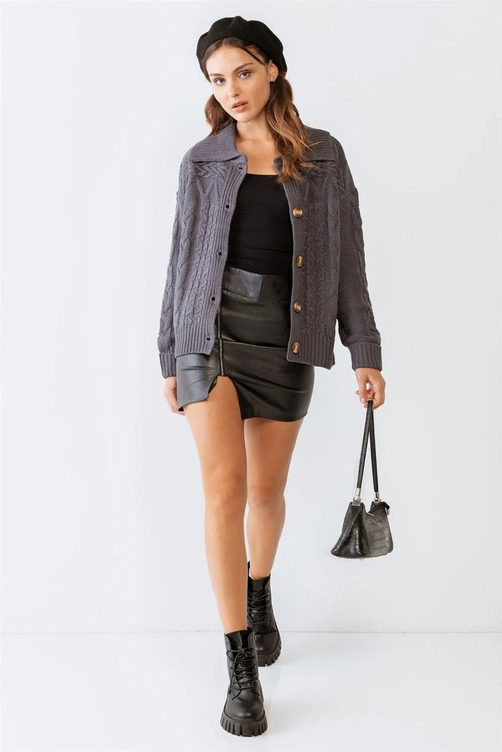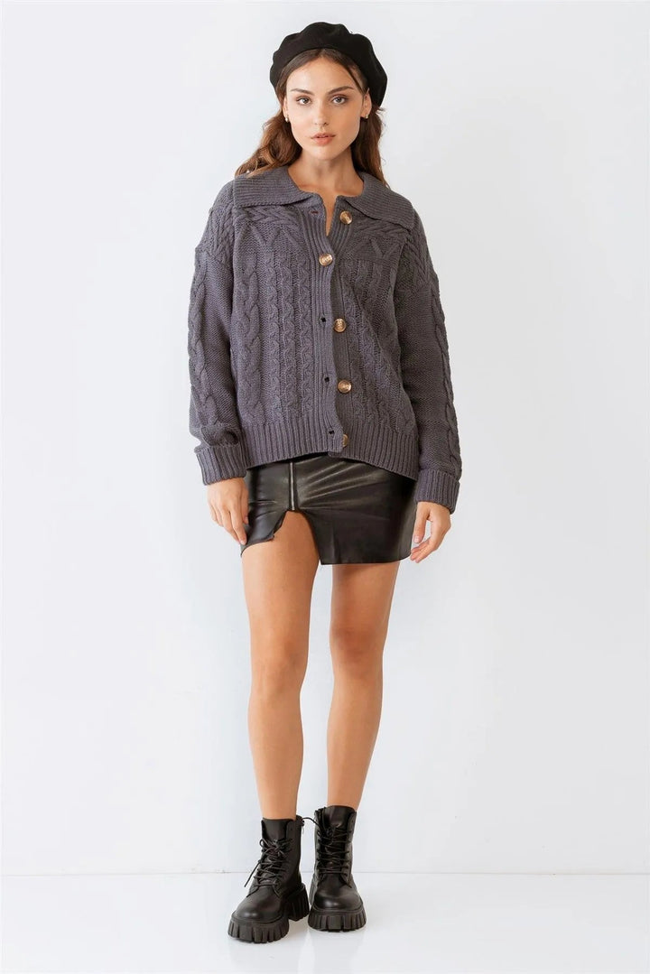 🖤 Stay cozy and stylish with our Cable Knit Collared Neck Button-Up Cardigan. Perfect for fall and winter, it features a charming charcoal color and a soft, comfy cable knit. The collared neckline and front contrast button-up closure add a touch of sophistication to this casual piece. Stay warm and fashionable all season long!