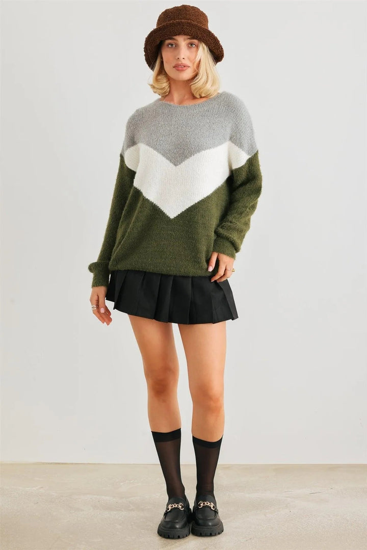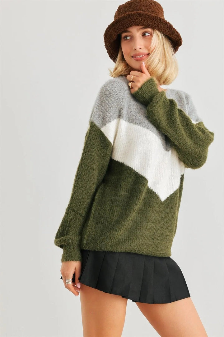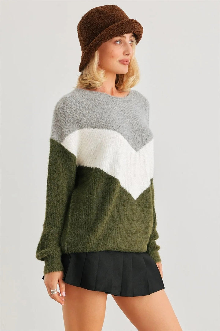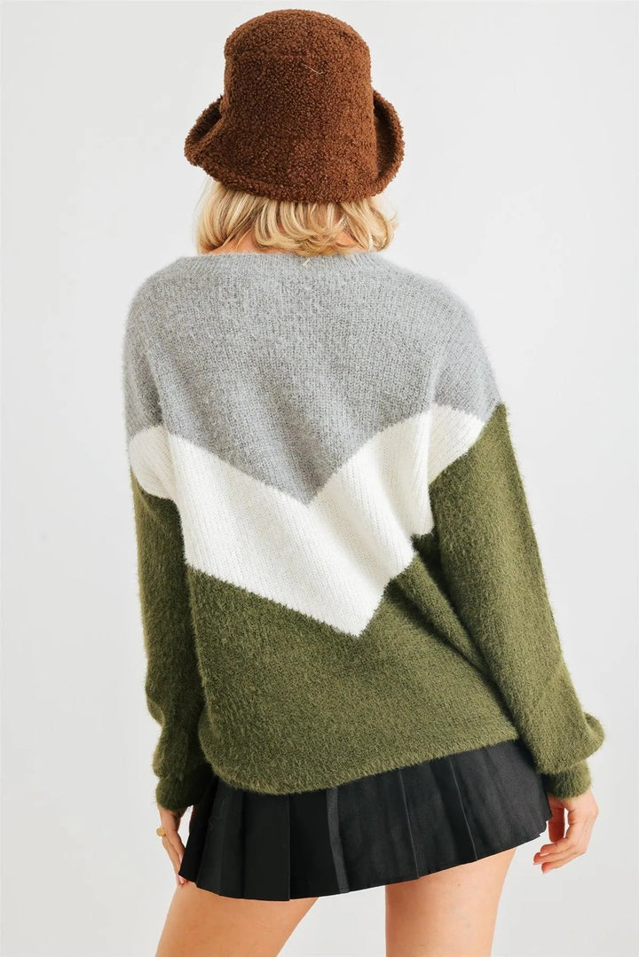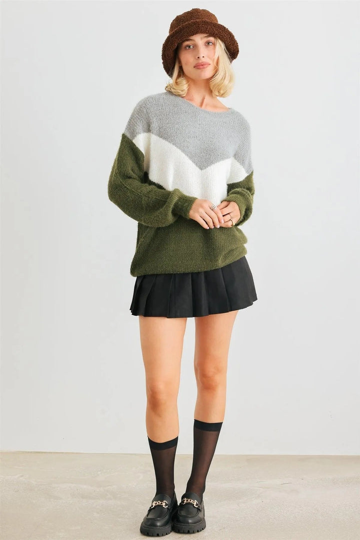 Heather Grey Green Colorblock Sweater – Women’s Fuzzy Knit Long Sleeve Pullover
