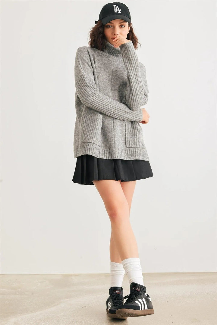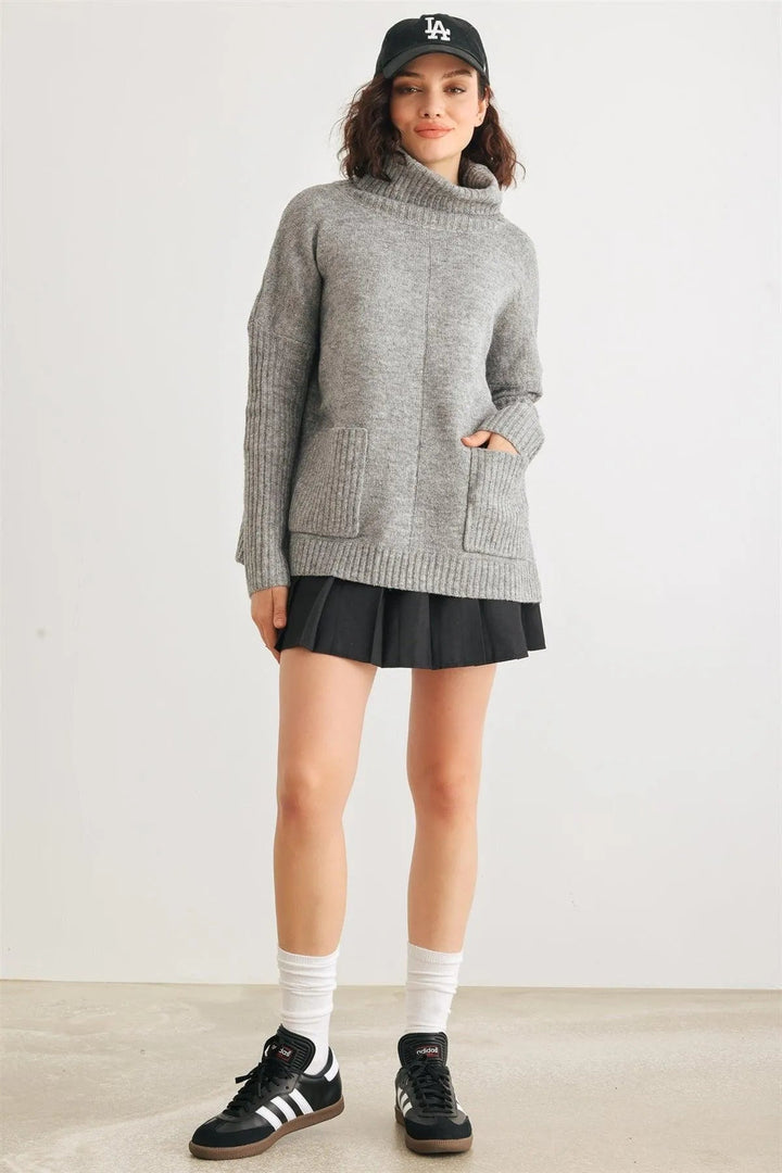 Heather Grey Turtleneck Knit Sweater – Women’s Long Sleeve Pullover with Pockets