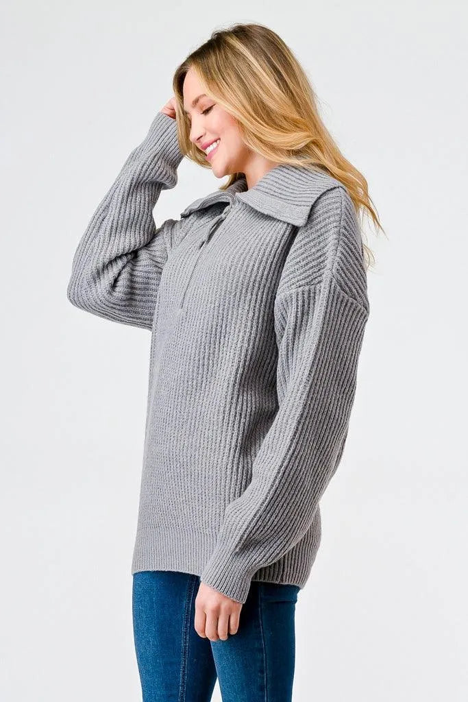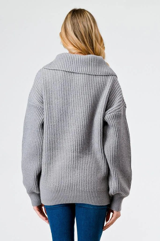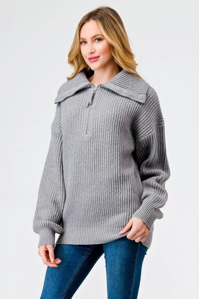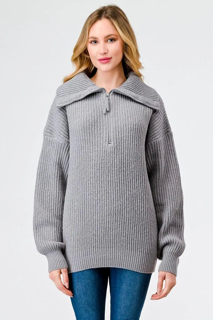 Light Grey Zip-Up Turtleneck Sweater – Women’s Long Sleeve Pullover