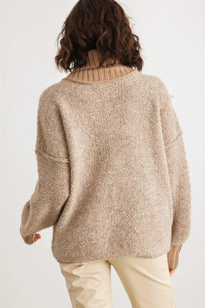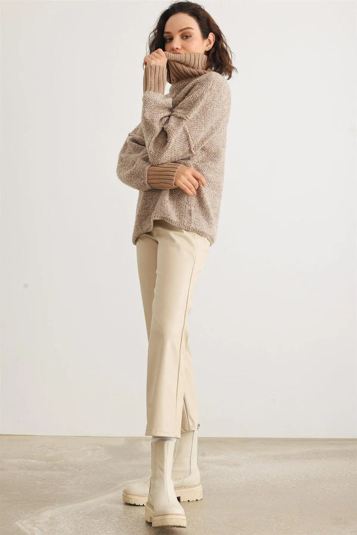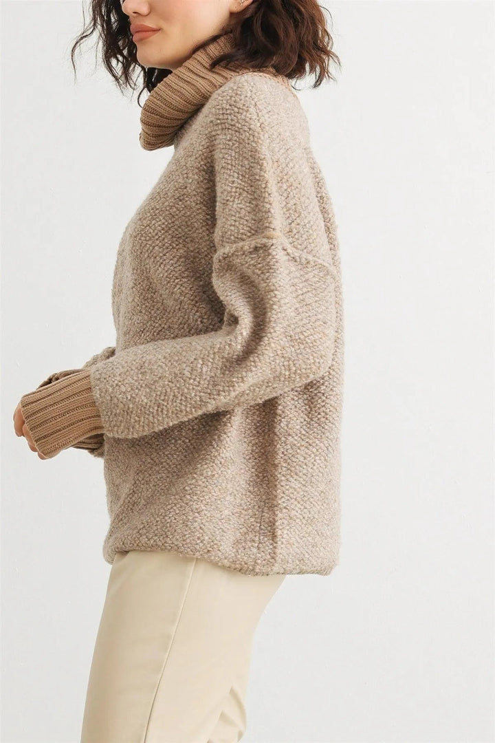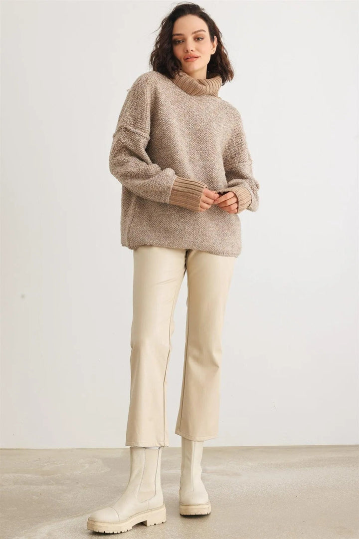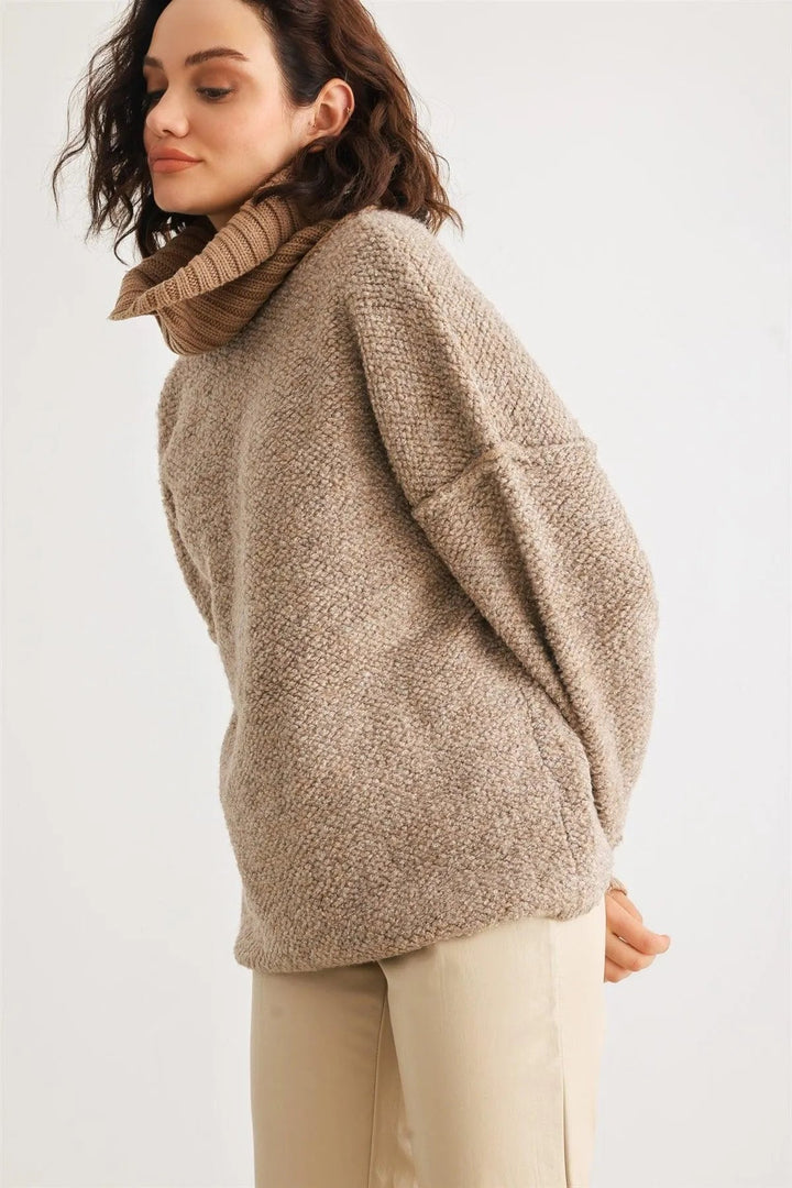 Mocha High Neck Knit Sweater – Women’s Loose Fit Long Sleeve Pullover