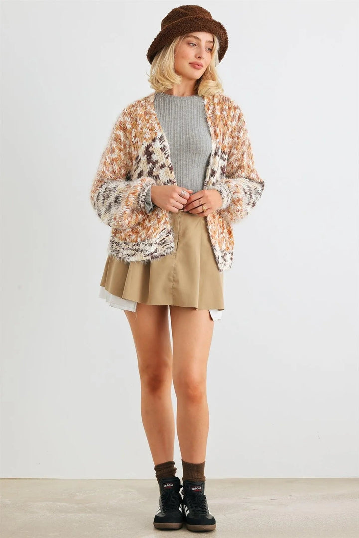 Mocha Mix Fuzzy Knit Open Front Cardigan – Women’s Two Pocket Sweater Coat