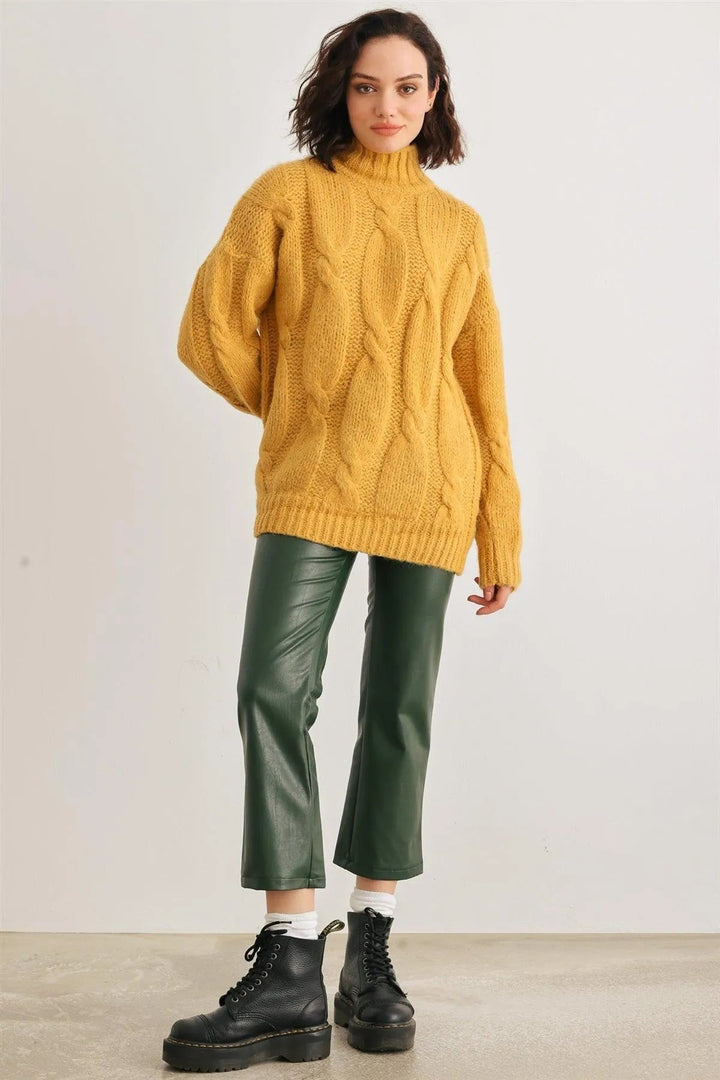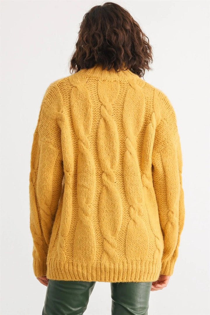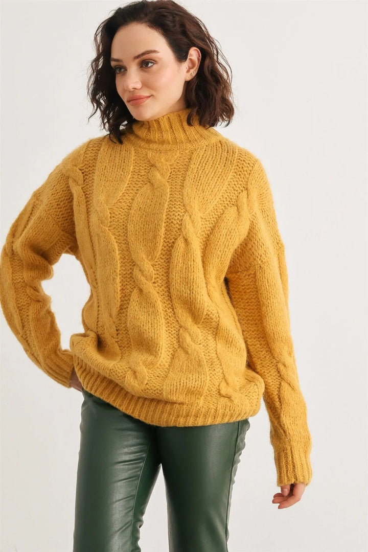 Mustard Turtleneck Cable Knit Sweater – Women’s Warm Long Sleeve Pullover